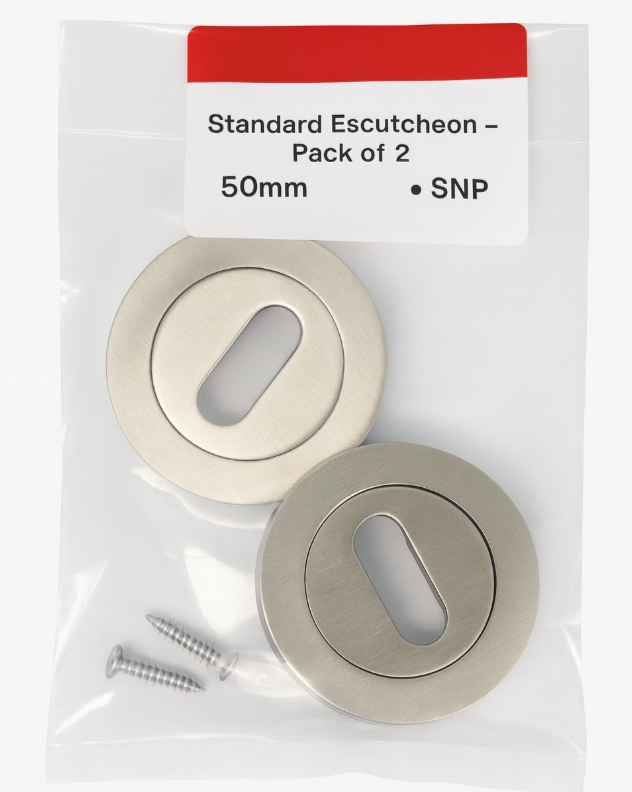 A pair of 50 mm standard escutcheons with a satin nickel plated finish, designed to neatly cover keyholes and protect the door surface. Supplied in a pack of 2 with fixing screws included.